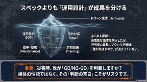 ③運用ルール(SOP)が曖昧 機体管理や、誰が飛行の「GO/STOP」の最終判断をするのか、関係機関とどう連携するのかといったルールが整備されていないと、いざという時に機能しません。