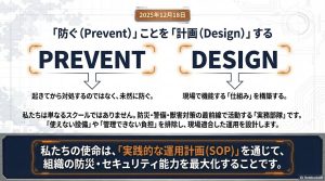 私たちの社名「PREVENT DESIGN(プリベントデザイン)」には「防ぐ(prevent)ことを計画(design)する」という強い意志が込められています。起きてから対処するのではなく、起きる前から「起きても動ける仕組み」を設計することが私たちの理念です。